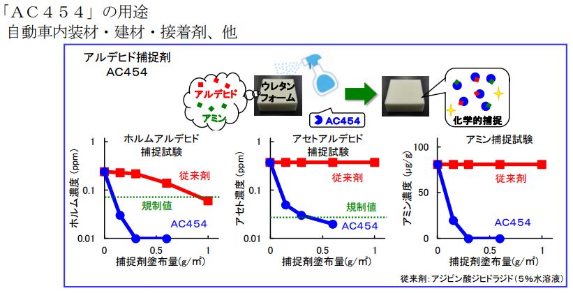 3/6 東ソーは自動車や住宅でのVOC対策に有効なキャッチャー材「AC454」を開発したと発表した。これによれば同社製品は従来型のVOC補足材に比べウレタンフォーム等から発生するアルデヒド類やアミン類に対し、高い補足性を持つという。