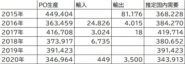 国内のPOメーカーは住友化学、AGC、トクヤマの3社で合計39万9千トンの生産能力。経産省統計によれば2019年の生産数量は39万1,414トンで、定修等を鑑みると実質的な稼働率は100%を超えていたとみられる。輸入は10KG、輸出はゼロであった。2020年の生産実績は3社で346,964トン。輸入はシンガポールから約450トン、輸出は中国向けに3,500トンが確認された。2015年に日本オキシラン(住友化学60%、ライオンデルバセル40%出資、SM41.2万トン、PO18.1万トン、PG10万トンの能力)が閉鎖後、まとまった数量の輸出は見当たらなかったが、2016年以来の輸出となった。