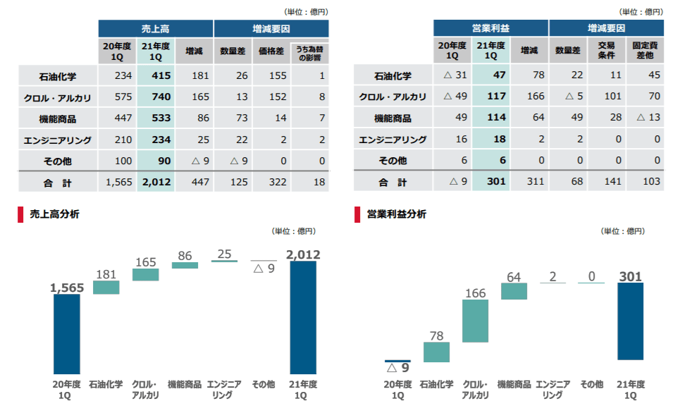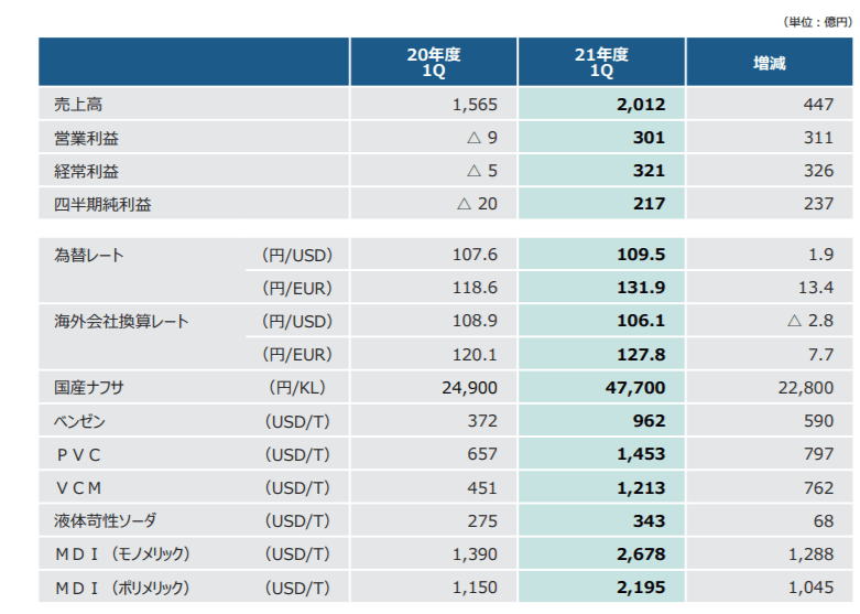 セグメント別では塩ビ、苛性ソーダ、MDI等を含むクロル・アルカリ事業が大きく牽引。塩ビ(PVC、VCM)市況は前年同期の2倍以上、MDI市況も2倍程度となっており収益改善に貢献した。