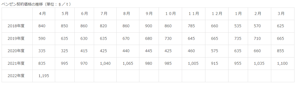 2022/4/1 ENEOS株式会社は2022年4月のベンゼンACPを発表した。これによれば4月のBZ ACPは前月比+95ドル/トンとなる1,195ドル/トン、円換算価格は152.1円/KG(前月比+19.4円/KG)となった。円貨の大幅な上昇は円安を受けてのもの。