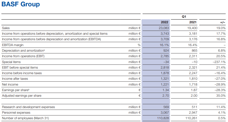 4/29 BASFは2022年1-3月期の四半期決算を発表した。
