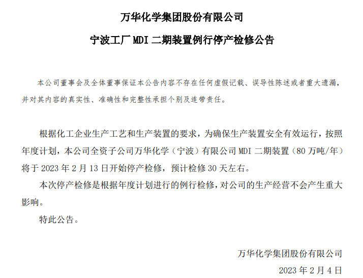 2023/2/4 万華化学集団(Wanhua Chemical Group)は設備の安全運転の為、同社寧波工場の第二期MDI製造装置(年産80万トン)の定期修理を実施すると発表した。
