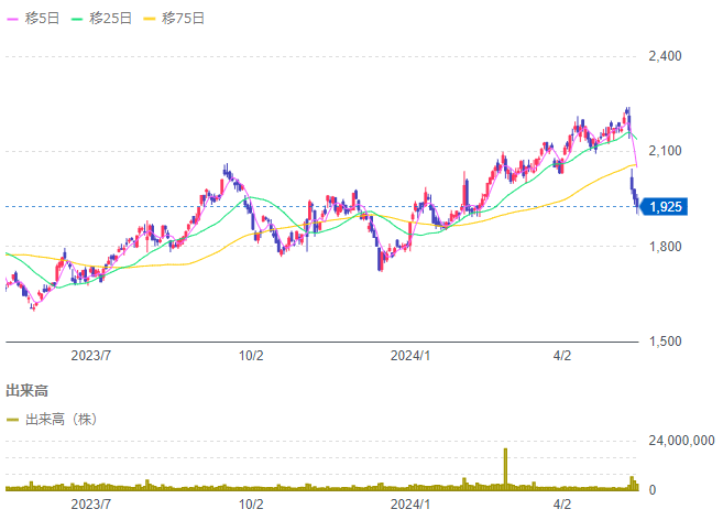 東ソーの株価は直近で1,925-1,930円前後。