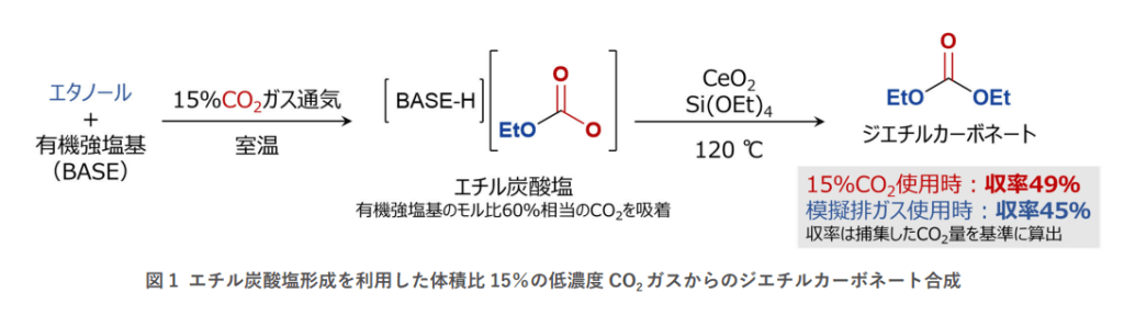 従来は高濃度、高圧下のCO2を使用する方法があったが、CO2の濃縮や高圧力を要する為、エネルギーを要するという課題があったが、今回の方法はエタノールと有機強塩基を用いたCI2の化学吸着によりエチル炭酸塩を得る反応を組み込むことで、一般的な排ガスに含まれる15%程度の濃度のCO2や、常圧下でのジエチルカーボネートの合成に成功した。収率は従来法と大きく変わらないという。
