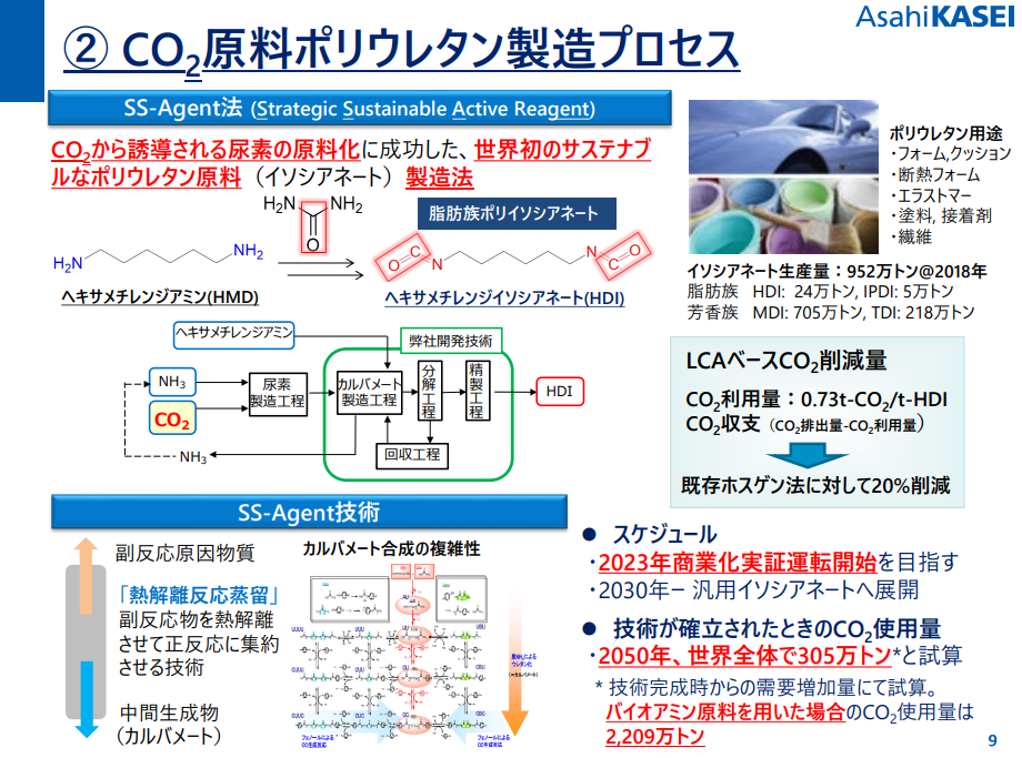 同社が2020年に発表した資料によれば、CO2由来の尿素を利用したカルバメート製造プロセス(尿素法イソシアネート製造プロセス)を使用することで、既存ホスゲン法に比べCO2排出量を20%減らすことが出来るという。
