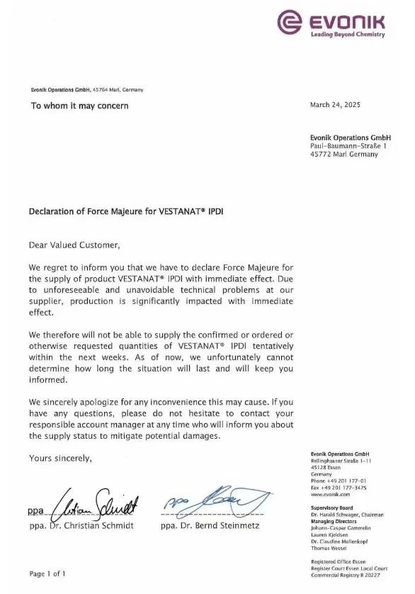 EVONIK IPDIの供給にフォースマジュールを宣言 投稿日: 2025年3月31日 投稿者: pujapan 2025/3/24 EVONIKはIPDI(VESTANAT® IPDl)の供給にForce Majeureを宣言した。予測不能且つ避けられない技術的課題が原料サプライヤーに生じた為としている。Webメディアなどが報じている。 引用・ソース:https://www.hzeyun.com/research/2601243.html 共有: クリックして X で共有 (新しいウィンドウで開きます) X Facebook で共有するにはクリックしてください (新しいウィンドウで開きます) Facebook いいね 読み込み中… 関連