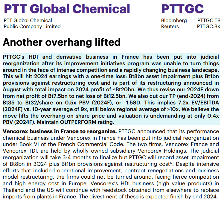 証券会社のレポート(innovest 社レポート、2024年9月)によればPTTGCのフランスにおけるHDI及び誘導品事業は、熾烈な競争と急速に変化する事業環境の中で改善策が奏功しなかったため、司法による再編手続きに入り、80億バーツの減損と10億バーツの再編費用引き当て金が生じたとしている。