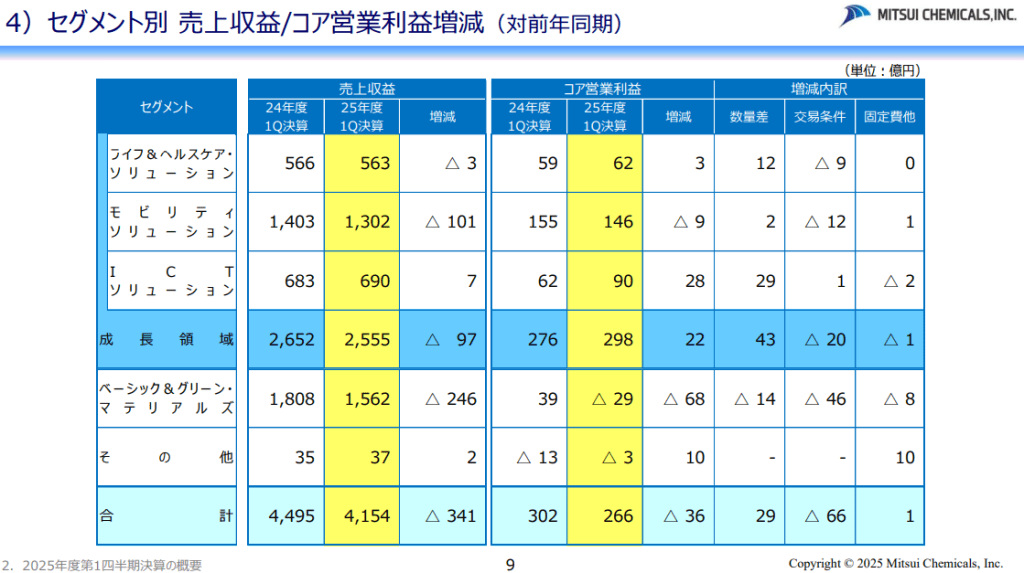 セグメント別では、同社が成長領域とするライフ&ヘルスケア・ソリューション、モビリティソリューション、ICTソリューションの合計では、減収増益となった。ベーシック&グリーン・マテリアルズでは売上は▲13.6%の減益、コア営業利益は29億円のマイナスとなった。(前期は39億円の黒字)