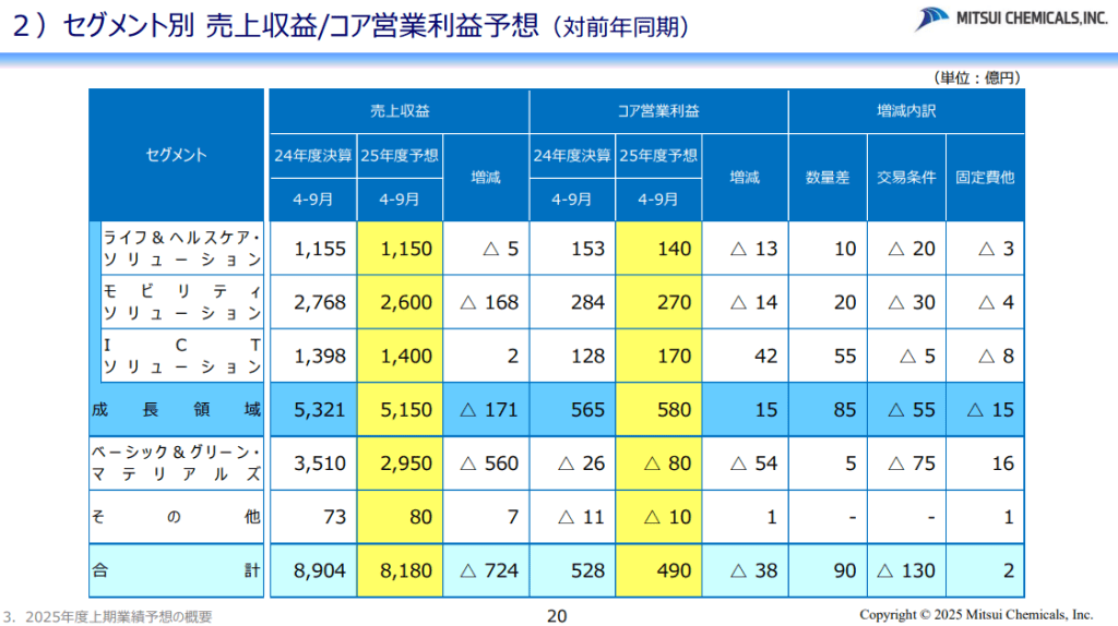 ベーシック&グリーン・マテリアルズのコア営業利益の増減要因のうち石化、基礎化共に原料価格下落による在庫評価損が大きい。ウレタンに関しては持分法投資損益の増加があったとしている。これは韓国錦湖三井化学でのMDI事業とみられる。