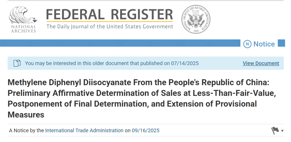 2025/9/16 米国際貿易省は中国産MDIが米国において公正価格を下回る価格で販売されている、又は販売される可能性があると暫定的に判断したと発表した。